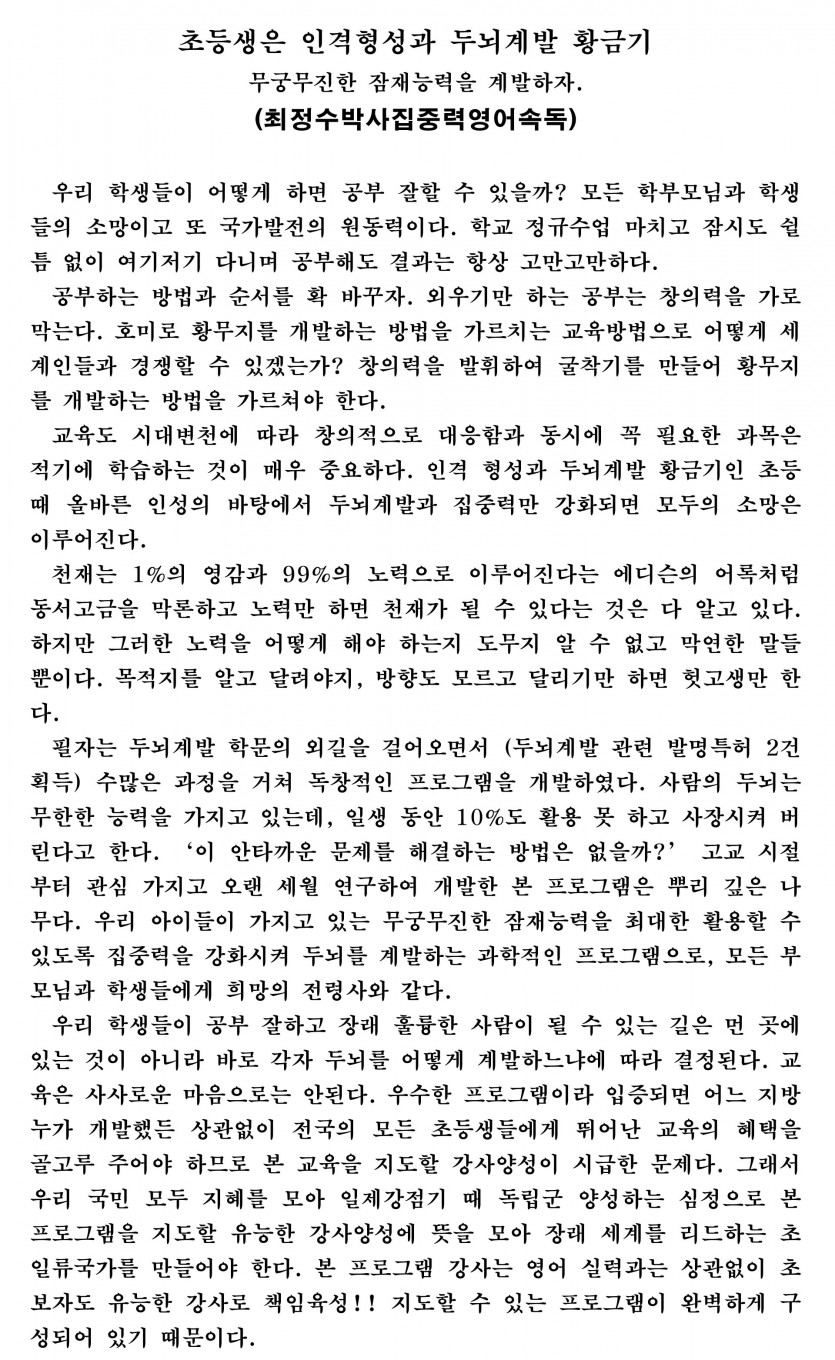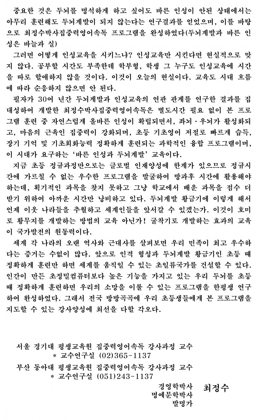 초등생은 인격형성과 두뇌계발 황금기! 무궁무진한 잠재능력을 계발하자 (최정수박사집중력영어속독) 페이지 정보 작성자 최고관리자 댓글 0건 조회 1,316회 작성일 21-05-13 13:34 목록 본문 . 목록 댓글 0 댓글목록 등록된 댓글이 없습니다.