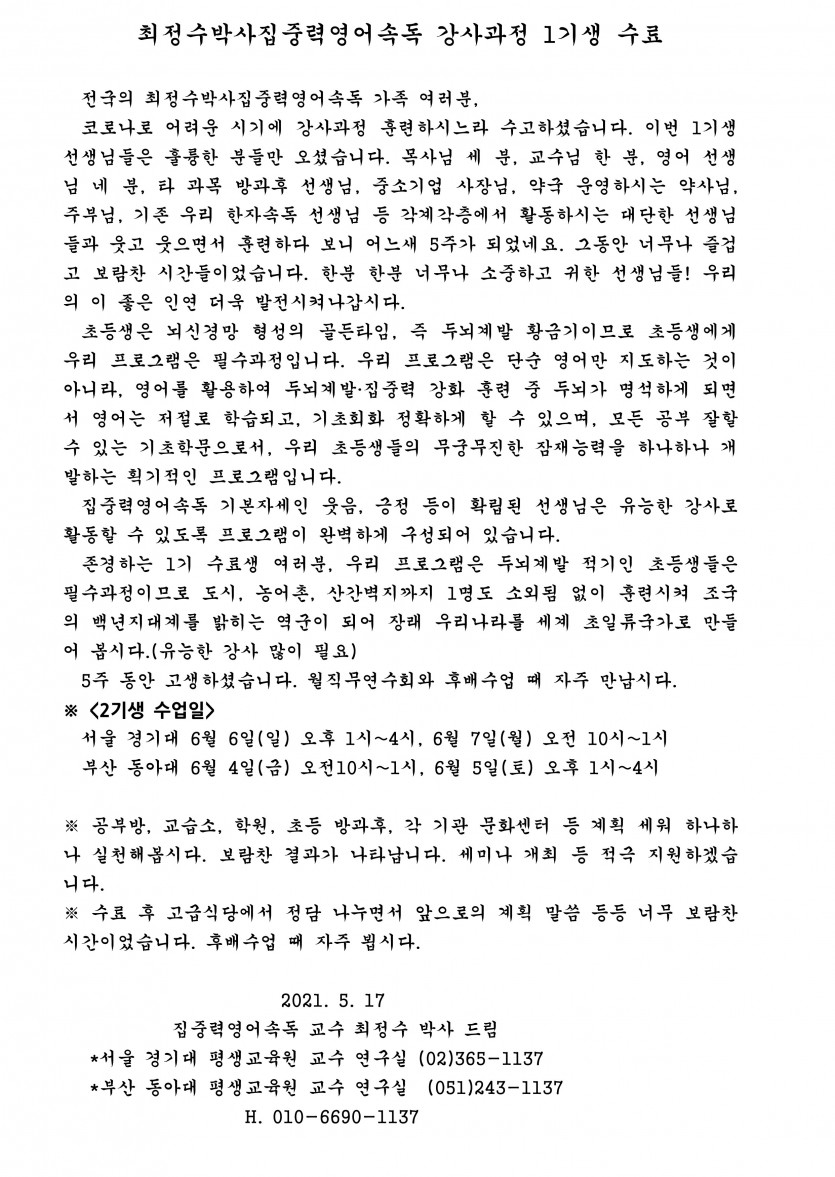 최정수박사집중력영어속독 강사과정 1기생 수료 페이지 정보 작성자 최고관리자 댓글 0건 조회 1,430회 작성일 21-05-17 10:13 목록 본문 . 목록 댓글 0 댓글목록 등록된 댓글이 없습니다.