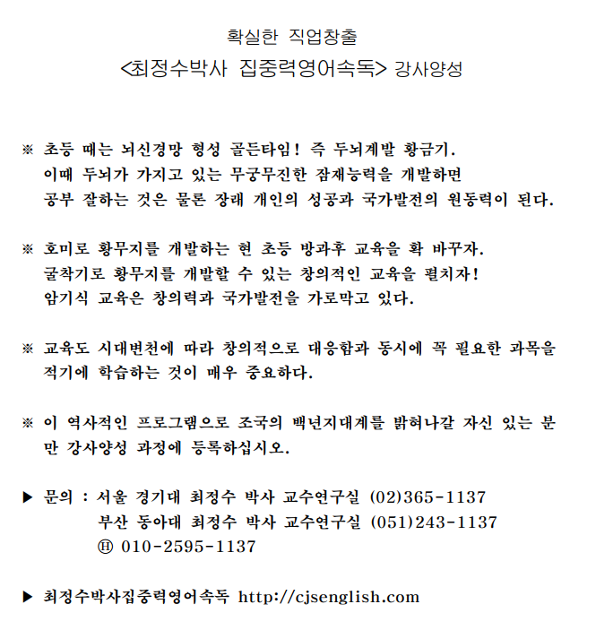 확실한 직업창출 <최정수박사 집중력영어속독> 강사양성 페이지 정보 작성자 최고관리자 댓글 0건 조회 1,533회 작성일 21-06-15 17:35 목록 본문 . 목록 댓글 0 댓글목록 등록된 댓글이 없습니다.