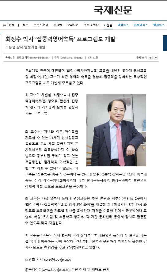 국제신문, 최정수박사집중력영어속독 우수성 보도 2021.3.4 페이지 정보 작성자 최고관리자 댓글 0건 조회 1,181회 작성일 21-03-09 09:39 목록 본문 국제신문에, 최정수박사집중력영어속독 우수성이 보도되었습니다. 목록 댓글 0 댓글목록 등록된 댓글이 없습니다.