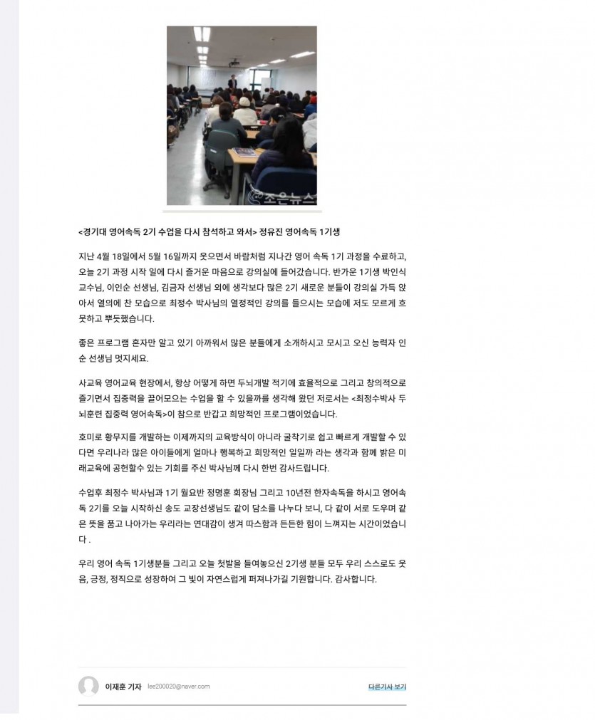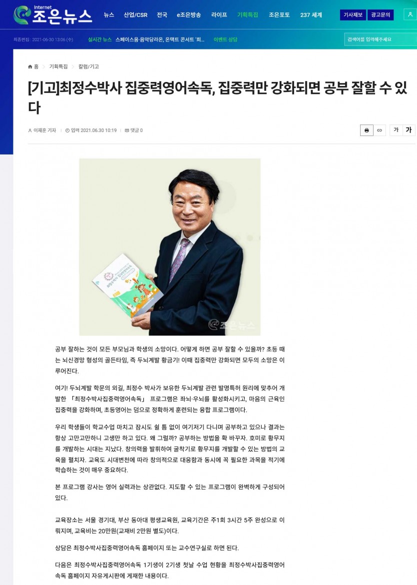조은뉴스 "최정수박사집중력영어속독"의 우수성 보도 2021.6.30 페이지 정보 작성자 최고관리자 댓글 0건 조회 4,133회 작성일 21-07-01 15:35 목록 본문 . 댓글 0 댓글목록 등록된 댓글이 없습니다.