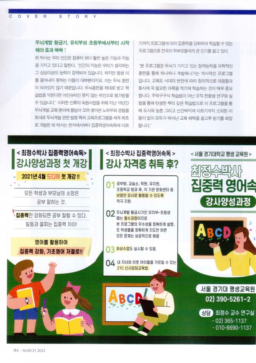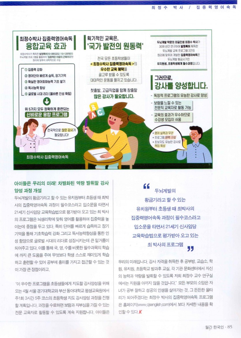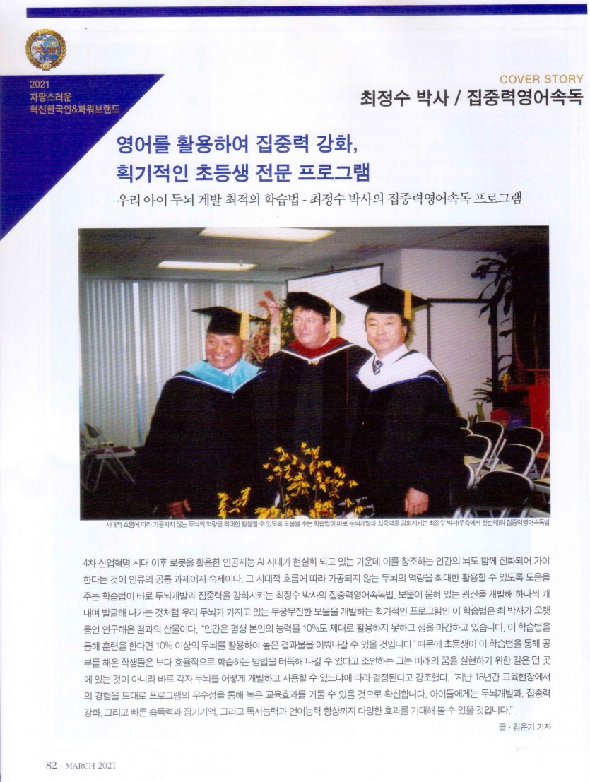 월간한국인 2021.3월호 <최정수박사집중력영어속독>의 우수성 보도 페이지 정보 작성자 최고관리자 댓글 0건 조회 4,056회 작성일 21-03-09 10:07 목록 본문 월간한국인 2021.3월호에 <최정수박사집중력영어속독>의 우수성이 보도되었습니다. 댓글 0 댓글목록 등록된 댓글이 없습니다.